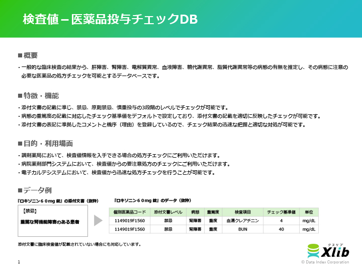 一般的な臨床検査の結果から、肝障害、腎障害、電解質異常、血液障害、糖代謝異常、脂質代謝異常等の病態の有無を推定し、その病態に注意の必要な医薬品の処方チェックを可能とするデータベースです。