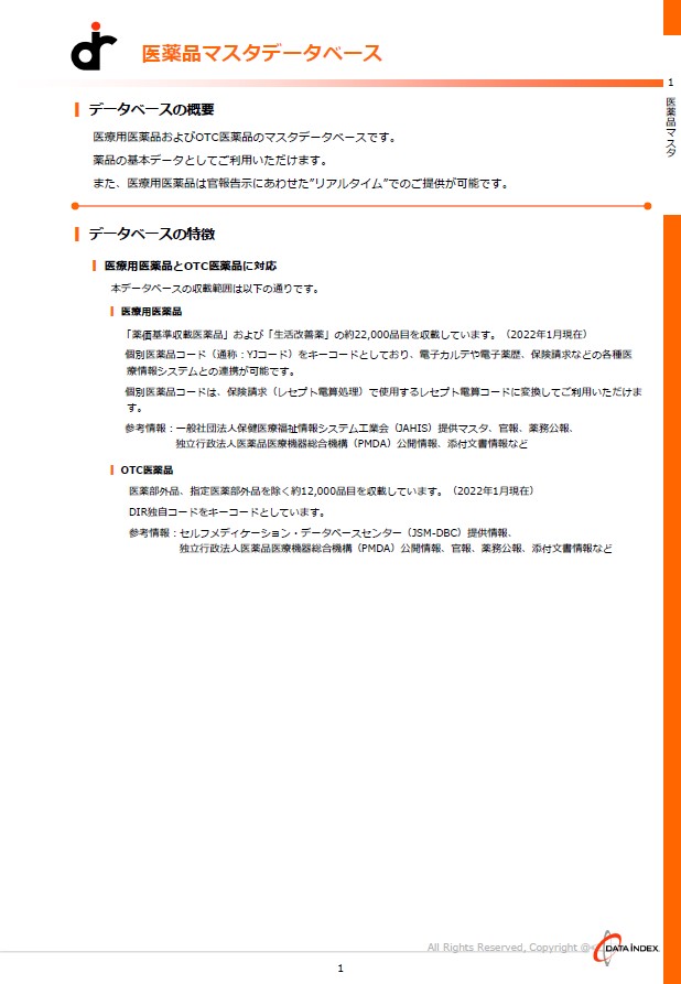 医療用医薬品のマスタデータベースです。個別医薬品コード、商品名、一般名など医薬品の基本データとしてご利用いただけます。
