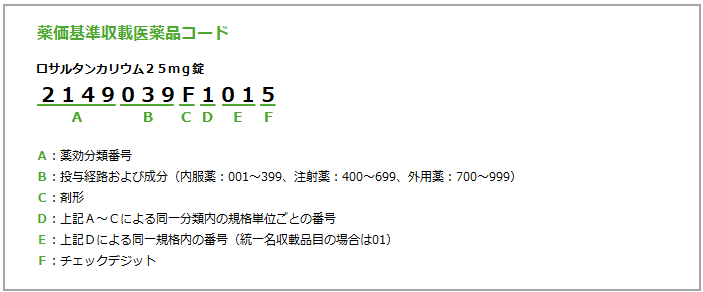 薬価ごとに設定されている英数12桁のコードです。厚生労働省により管理されており、厚労省コードとも呼ばれています。