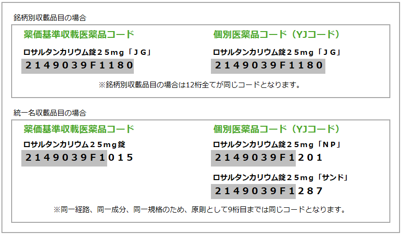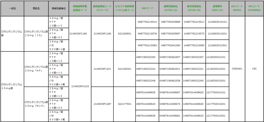一方、ロサルタンカリウム25mg錠は統一名収載のため、商品名では薬価基準に収載されておらず、統一名(一般名)に対して薬価基準収載医薬品コードが付与されます。この統一名に相当する個々の商品には、商品ごとに個別医薬品コード(YJコード)が付与されます。
