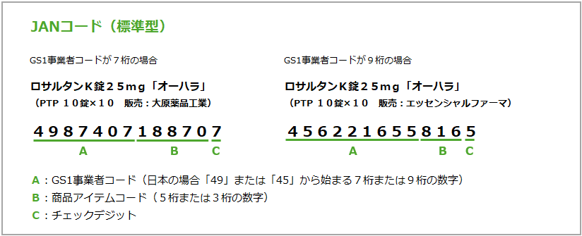 JANコードには13桁で構成される標準型と8桁の短縮型があり、前者はGTIN-13、後者はGTIN-8とも呼ばれています(GTINについては次の項目で説明します)。ほとんどの医療用医薬品では13桁の標準型が使われています。