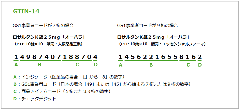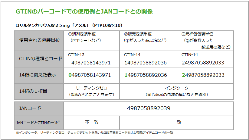 日本の医療用医薬品では、GTIN-13は調剤包装単位で、GTIN-14は販売包装単位および元梱包装単位で使用されています。14桁以外のGTINは前方を0で埋めた14桁に揃えて使用されます。この先頭の0はインジケータではなくリーディングゼロといいます。