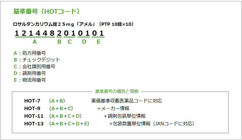 汎用されている医療用医薬品コードとの対応付けを目的として作成された13桁のコードです。HOTコード、HOT番号とも呼ばれています。