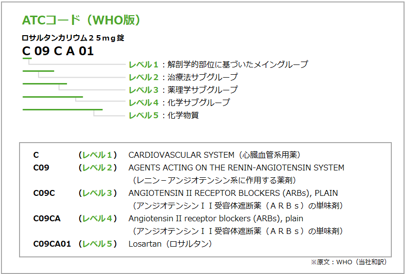 解剖治療化学分類法(Anatomical Therapeutic Chemical Classification System)に基づく最大7桁のコードです。医薬品使用状況の統計研究のために世界保健機関(WHO)が統括管理しており、薬効、作用部位・化学的な特徴によって5段階までのレベルで分類されています。