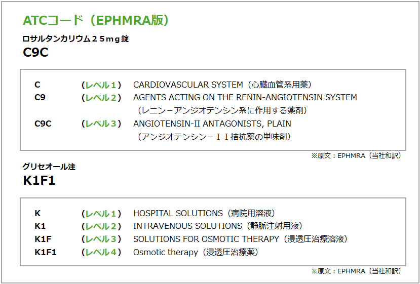 解剖治療化学分類法(Anatomical Therapeutic Chemical Classification System)に基づく最大4桁のコードです。医薬品市場調査やマーケティング目的で欧州医薬品市場調査協会(EPHMRA)が統括管理しており、適応症、薬効、投与経路などの特徴によって4段階までのレベルで分類されています。