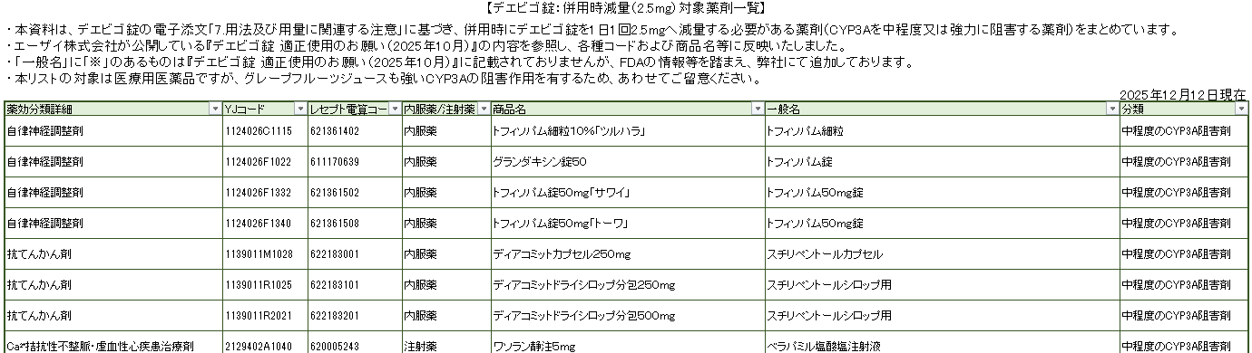 この度、製造販売元のエーザイ株式会社より発出された『デエビゴ錠 適正使用のお願い(2025年10月)』1)に基づき、併用時にデエビゴ錠を「1日1回2.5mg」へ減量する必要がある薬剤(CYP3Aを中程度又は強力に阻害する薬剤)について、当社の医療用医薬品マスタDBをもとに対象薬を抽出し、商品名やYJコード・レセプト電算コード等をまとめたリストを作成いたしました。